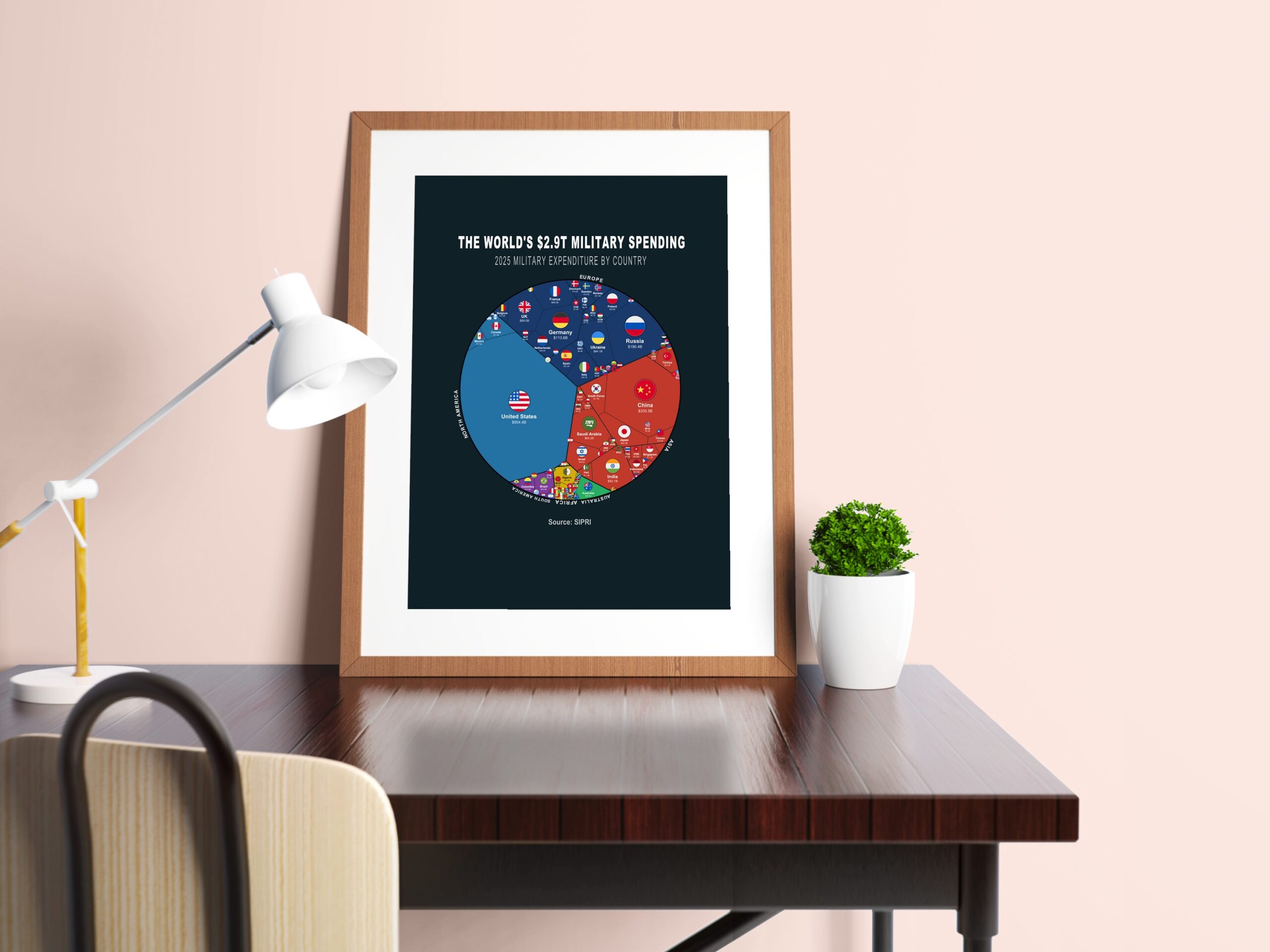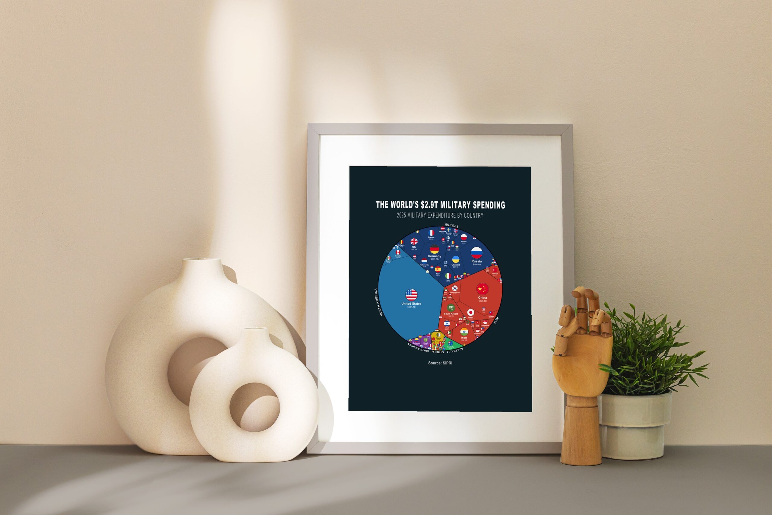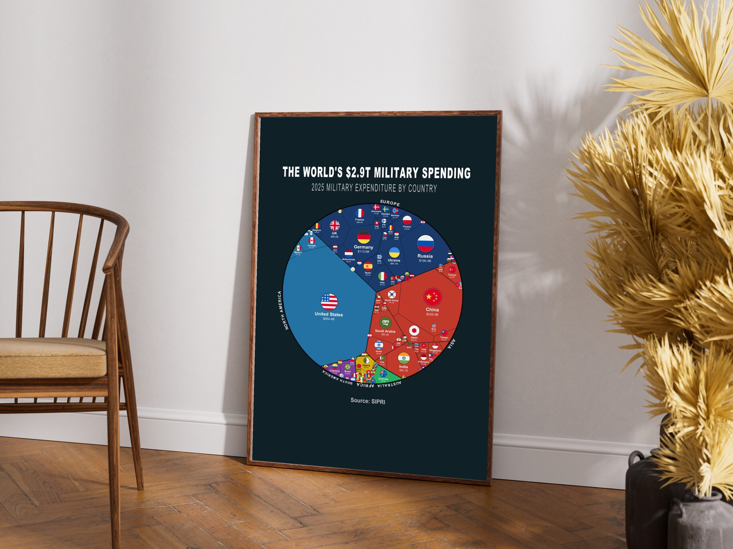 This unique poster by Everything Econ visualises the world’s $2.9t military spending, presented in a distinctive voronoi-style data visualisation. Data sourced from SIPRI. Perfect for bedrooms, offices, classrooms, or as a thoughtful gift.